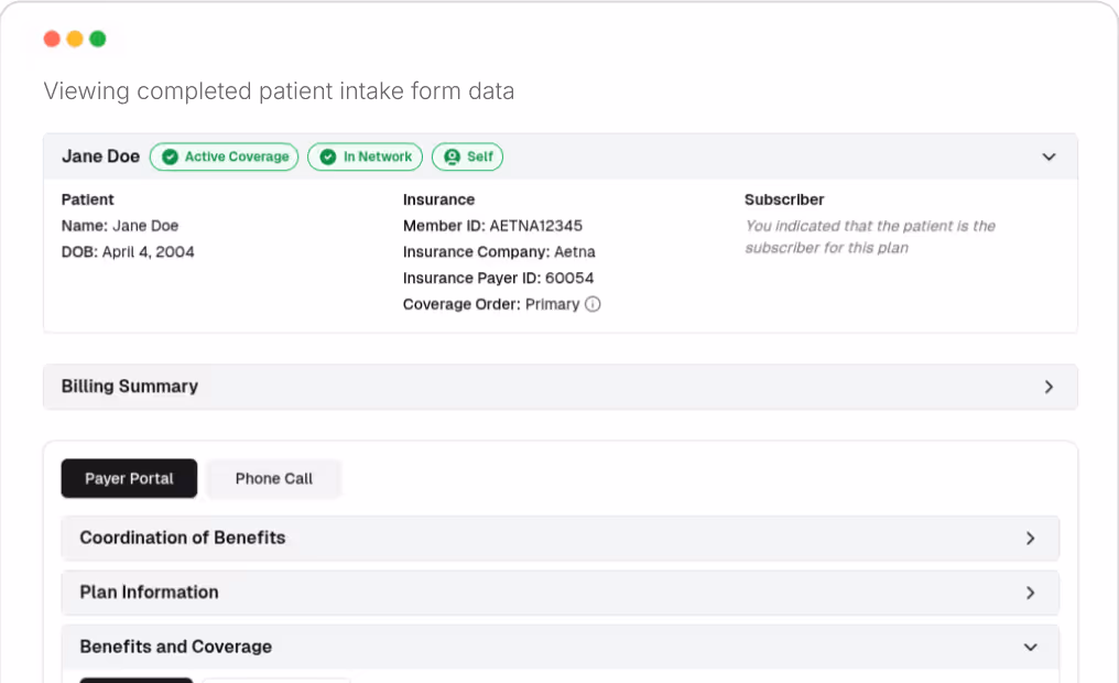 Patients photograph their insurance cards using our secure platform, and our software automatically extracts and populates insurance information. This eliminates manual typing errors and speeds up verification since we can start using the information immediately to check benefits and estimate patient costs.