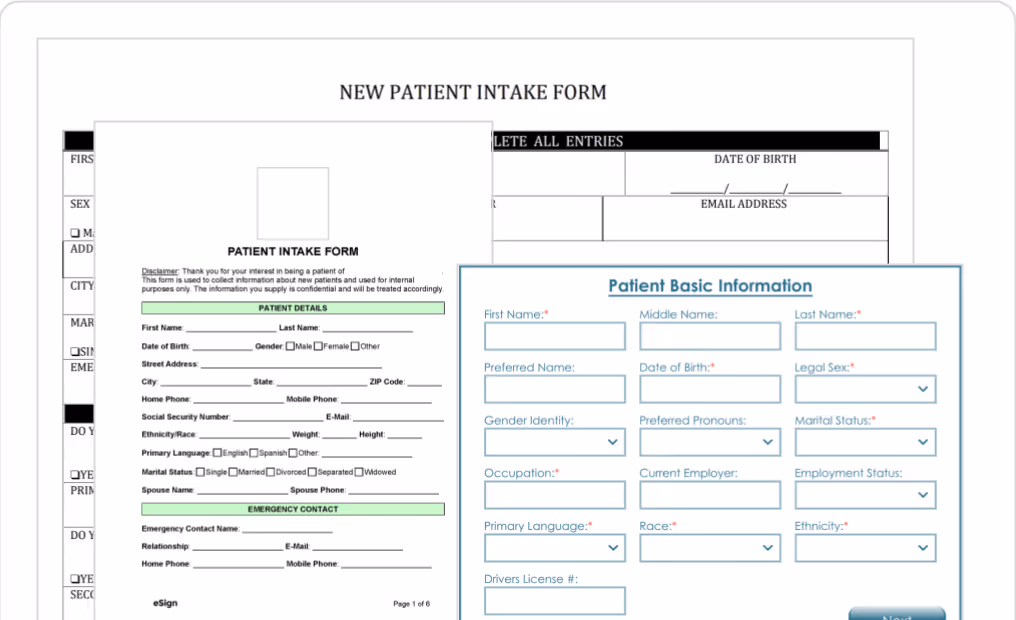 Replace paper forms with digital capture upfront to collect complete patient data before appointments. Staff save time on data entry, with no need to chase missing information.