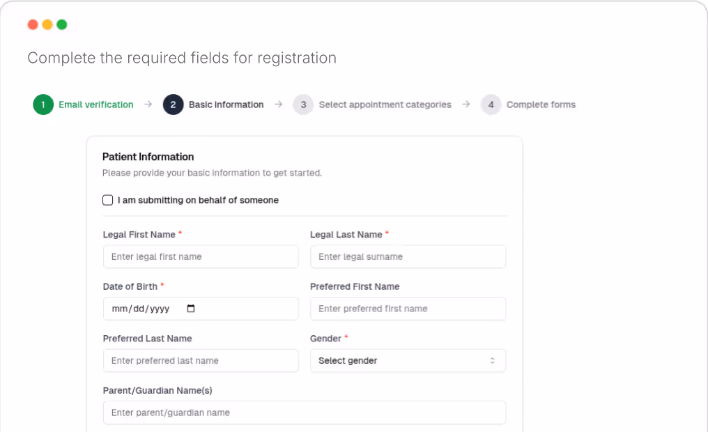 All key details like demographics, insurance, and consent are captured in a single simple flow. No back-and-forth with staff chasing for missing information.